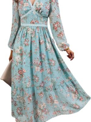 Women’s Spring Wrap Maxi Dress Floral V Neck Long Sleeve Wedding Guest Party Casual Chiffon Dress