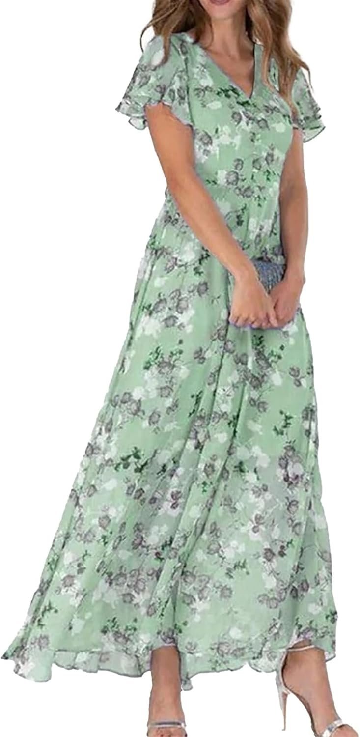 - Elegant Boho Chic Design – This floral chiffon maxi dress combines bohemian elegance with delicate ruffle details, making it perfect as a wedding guest dress or for casual summer outings. The flowy A-line silhouette adds effortless grace to every step.