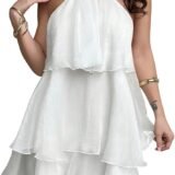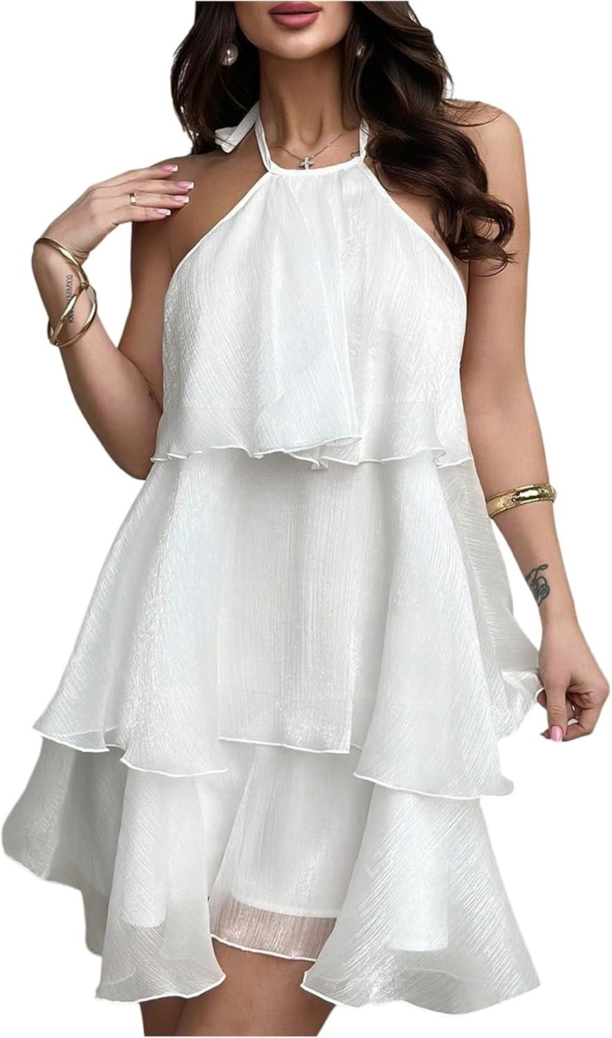 - Prom dresses, halter neck, backless, sleeveless, tiered layered, ruffle hem, tie back, short dress, elegant dress
